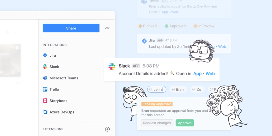 A big part of product team alignment is managing stakeholder approvals, and Zeplin has a dedicated feature for that that goes really well with the Slack and Teams integrations. With Approvals in Zeplin, you can capture and track stakeholder approvals right from the designs themselves.