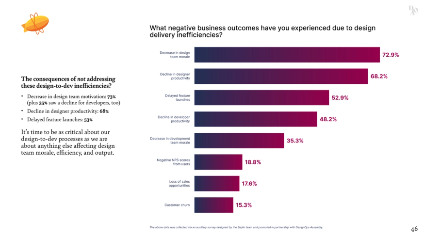 The findings showed us that not solving design-to-dev challenges results in a decrease in design team motivation — 73% of the people said that. 68% said it results in a decline in design productivity, and 52% said it results in a delay in future launches.