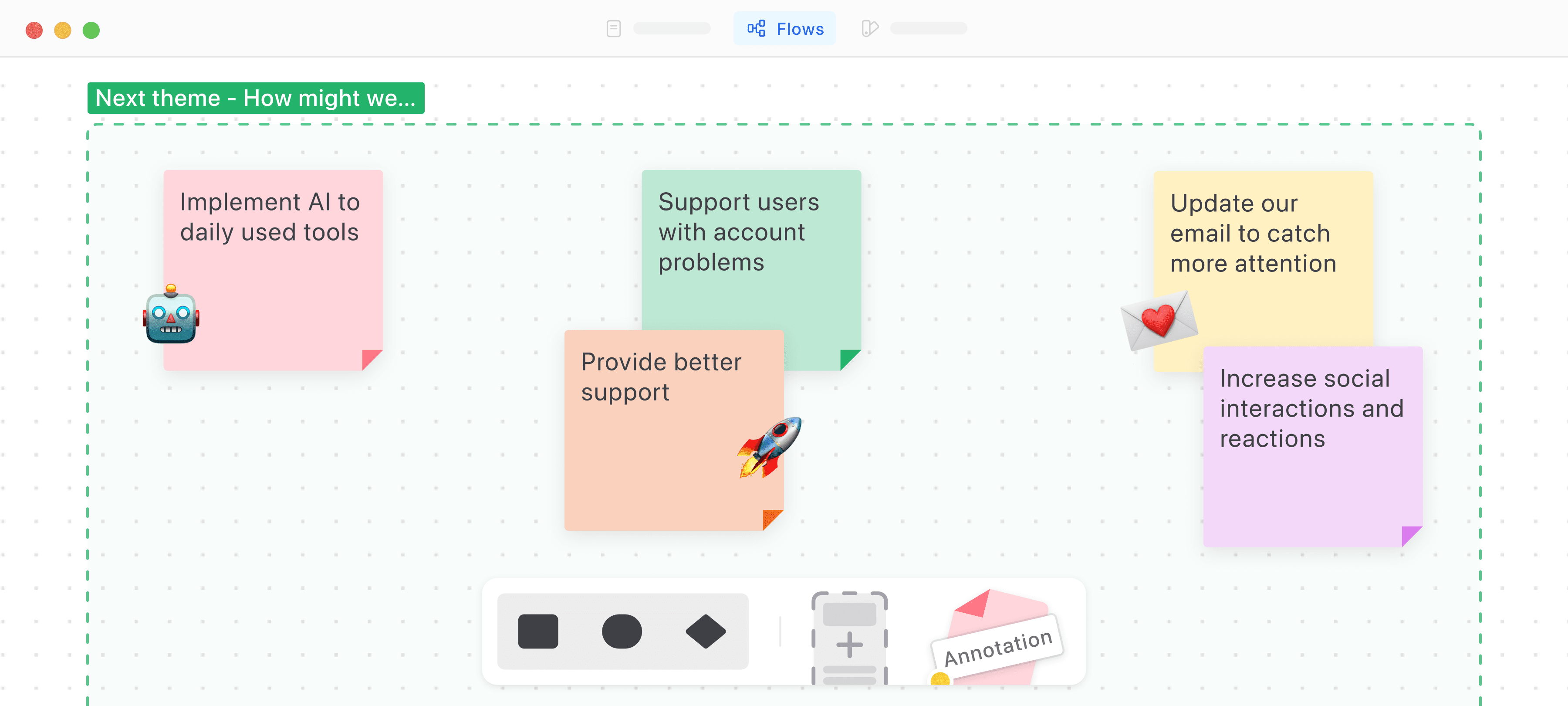 Annotations in flows start as simple sticky notes, perfect for quick thoughts while you’re mapping out a journey. You can use them as you’re brainstorming on a flow or jotting down rough ideas.